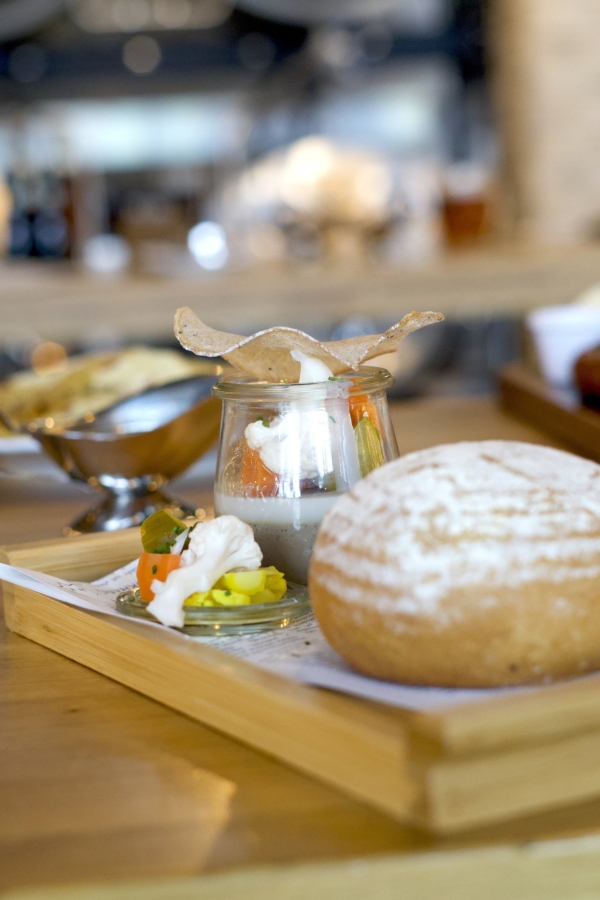 - Svatomartinská paštika, chlebový chips, marinovaná červená cibule a náš chléb