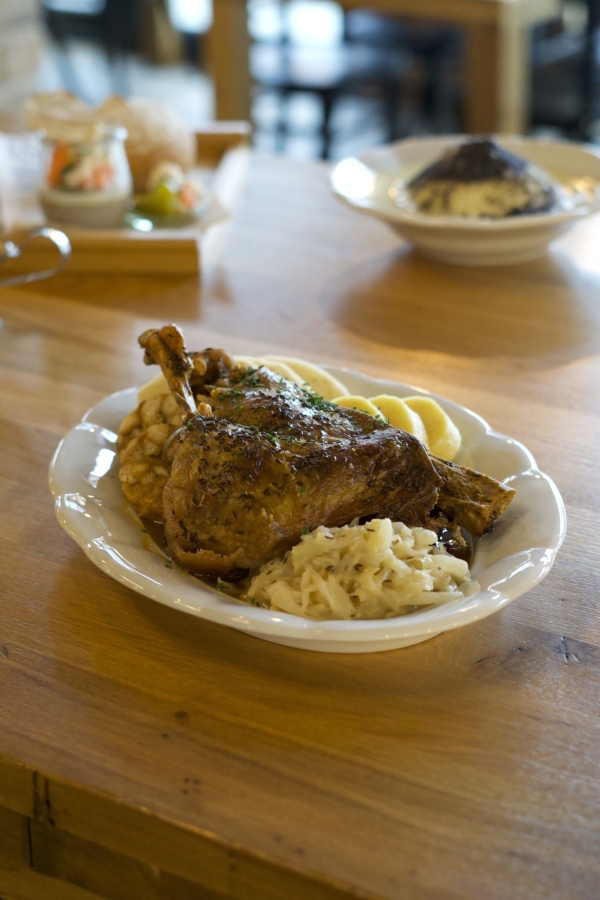 - 1/4 konfitované husy, červené a bílé zelí, bramborové a houskové knedlíky