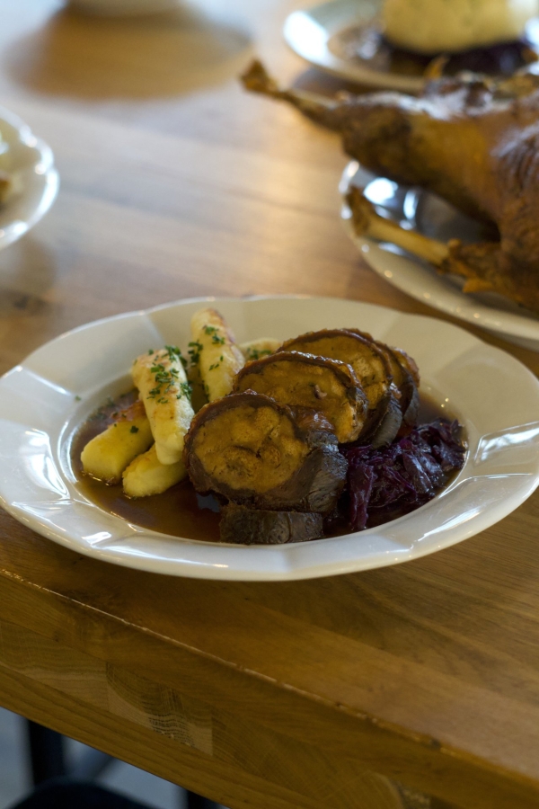 - Roláda z husích prsou s fáší, bramborovými šiškami a červeným zelím