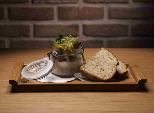 - Kroupové jelito s mačkaným bramborem a kysyným zelím