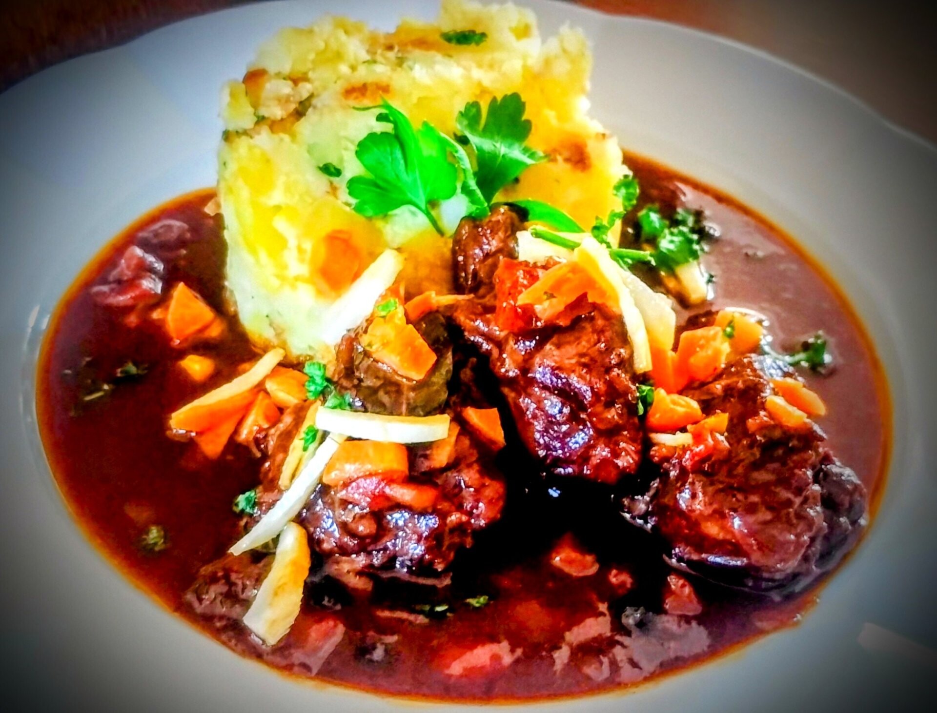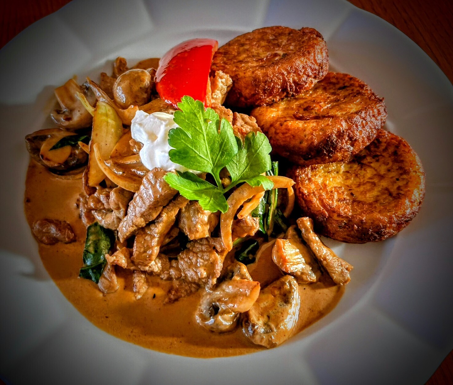 | 200g Hovězí striploin steak, omáčka z modrého sýru, fazolky, slanina, gratinované brambory | 385Kč | ||